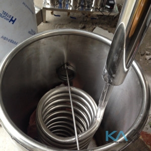 - Ngoài ra, một thiết bị vô cùng quan trọng trong quá trình nấu chúng ta phải kể đến là thiết bị ngưng tụ. Ở đây, bồn ngưng tụ với hệ thống ruột gà bên trong sẽ cấp nước sạch (nước lạnh ở nhiệt độ thường) hỗ trợ cho quá trình ngưng tụ rượu diễn ra nhanh chóng và hiệu quả.